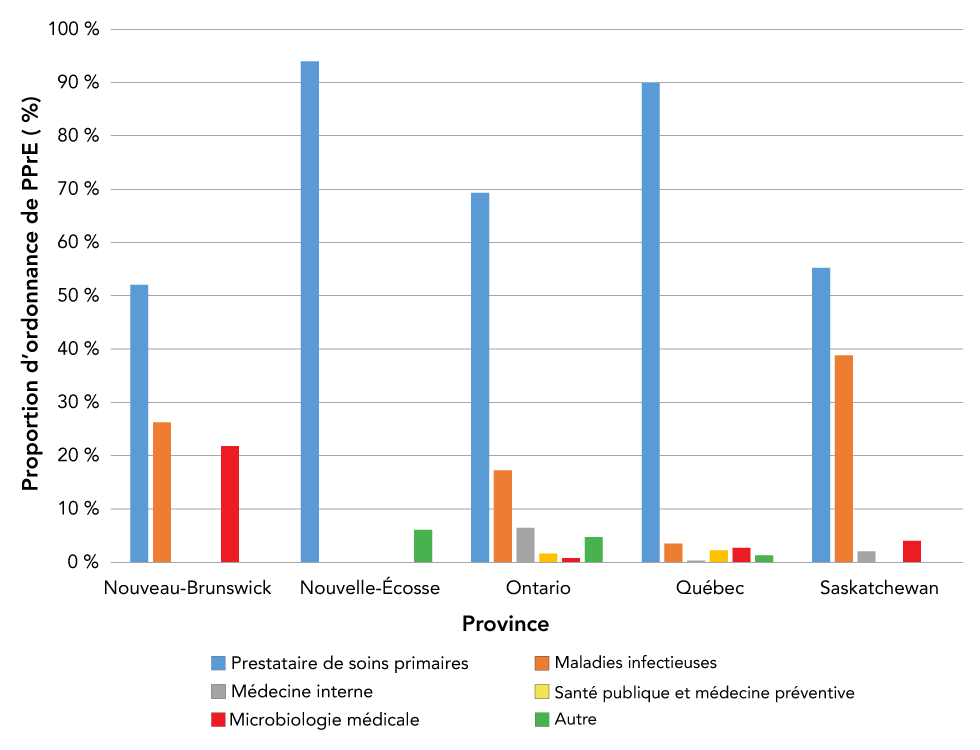 Ces dernières années, on a constaté une tendance à la baisse de PPrE prescrite par des spécialistes (maladies infectieuses et médecine interne), avec une augmentation de PPrE prescrite par des prestataires de soins primaires. Il importe de prendre en compte ces résultats alors que la disponibilité accrue de PPrE pour les personnes à risque d’acquisition du VIH continue d’être une priorité au Canada. Les prestataires de soins primaires peuvent jouer un rôle clé pour augmenter l’adoption de la PPrE dans le cadre d’une approche de la santé sexuelle et de la prévention des maladies, étant donné leur grande représentation dans le personnel de santéNote de bas de page 14Note de bas de page 15.