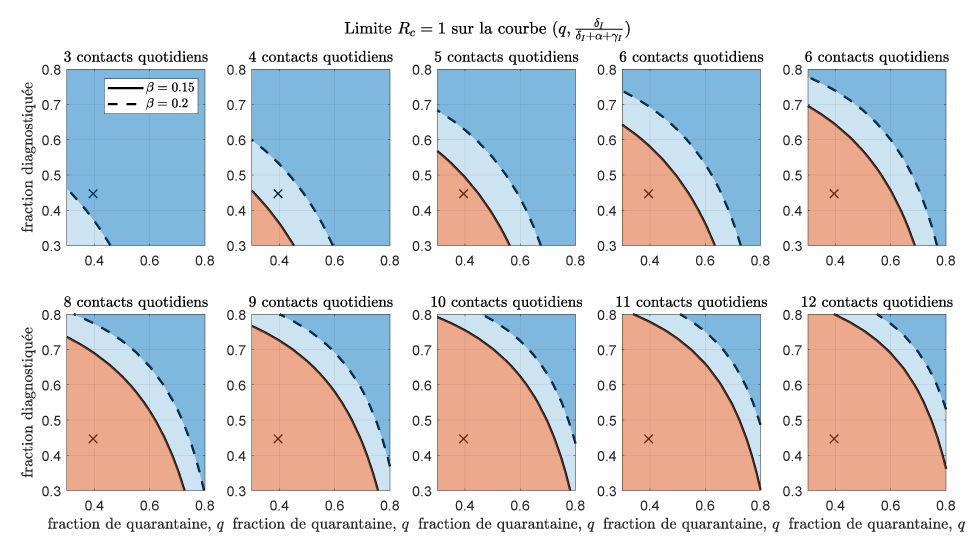 Chaque graphique de la figure montre la limite des valeurs pour la proportion de contacts retracés et mis en quarantaine q et la proportion de cas symptomatiques détectés et isolés δI/(δI + α+ γI), qui déterminent si l’épidémie est contrôlée. Chaque graphique affiche la limite correspondant aux différentes valeurs du taux de contact quotidien c, de trois à 12. Les croix représentent les paramètres estimés par ajustement de modèle jusqu’au 23 décembre 2020. Les courbes pleines et en pointillés représentent le seuil de contrôlabilité lorsque la probabilité de transmission β se situe aux valeurs estimées inférieures et supérieures, respectivement. La zone bleue représente la zone du paramètre qui permet le contrôle (bleu clair : le contrôle n’est possible que si la transmissibilité est à la valeur inférieure β = 0,15; bleu foncé : contrôle possible également pour la transmissibilité élevée β = 0,2), tandis que la zone rouge représente la zone de propagation de l’épidémie.