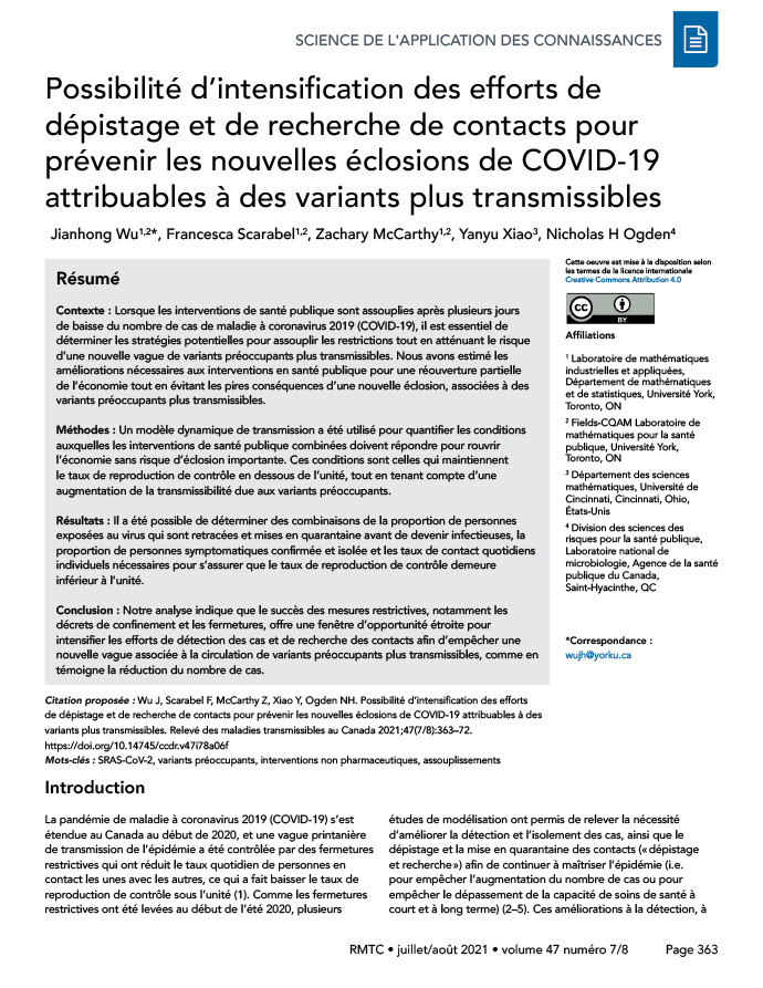 Wu J, Scarabel F, McCarthy Z, Xiao Y, Ogden NH. Possibilité d’intensification des efforts de dépistage et de recherche de contacts pour prévenir les nouvelles éclosions de COVID-19 attribuables à des variants plus transmissibles. Relevé des maladies transmissibles au Canada 2021;47(7/8):363–72. https://doi.org/10.14745/ccdr.v47i78a06f