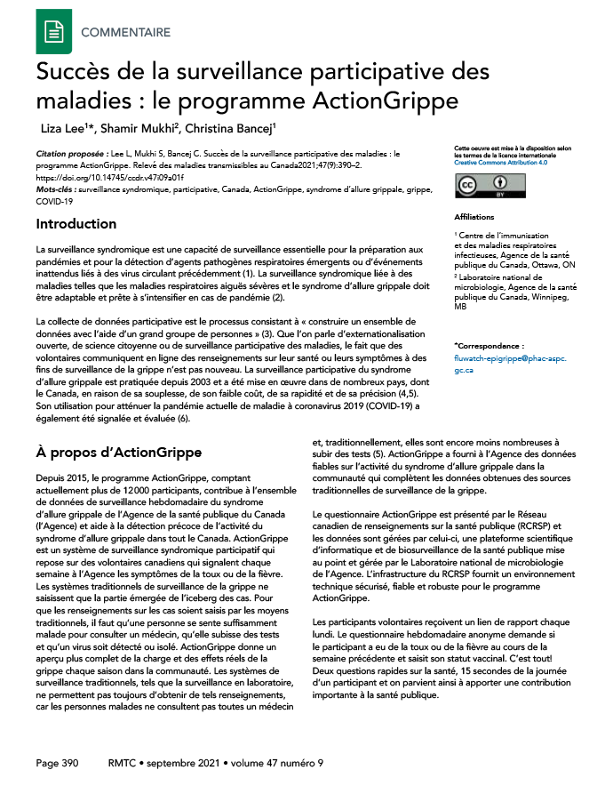 Lee L, Mukhi S, Bancej C. Succès de la surveillance participative des maladies : le programme ActionGrippe. Relevé des maladies transmissibles au Canada 2021;47(9):390–2. https://doi.org/10.14745/ccdr.v47i09a01f