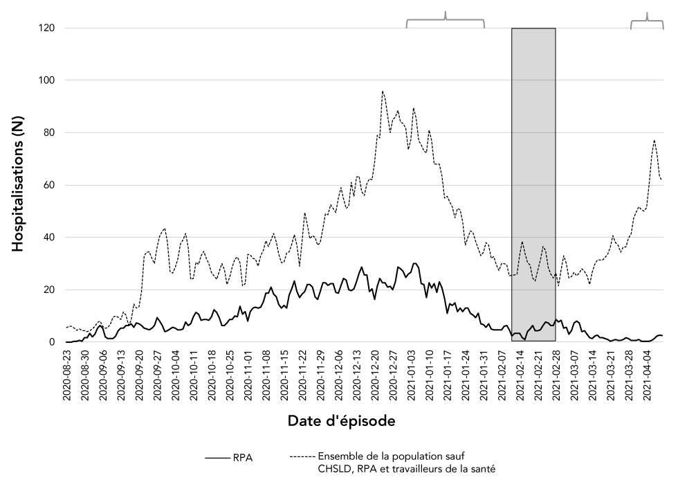 Bien que la vaccination des travailleurs de la santé et le resserrement des mesures de santé publique préventives au début de 2021 aient probablement réduit la transmission de la COVID-19, l’administration d’une première dose de vaccin aux résidents en CHSLD et en RPA semble avoir contribué à la diminution marquée de l’incidence de la COVID-19, des hospitalisations et de la mortalité dans ces milieux avant même l’administration de la deuxième dose de vaccin.
