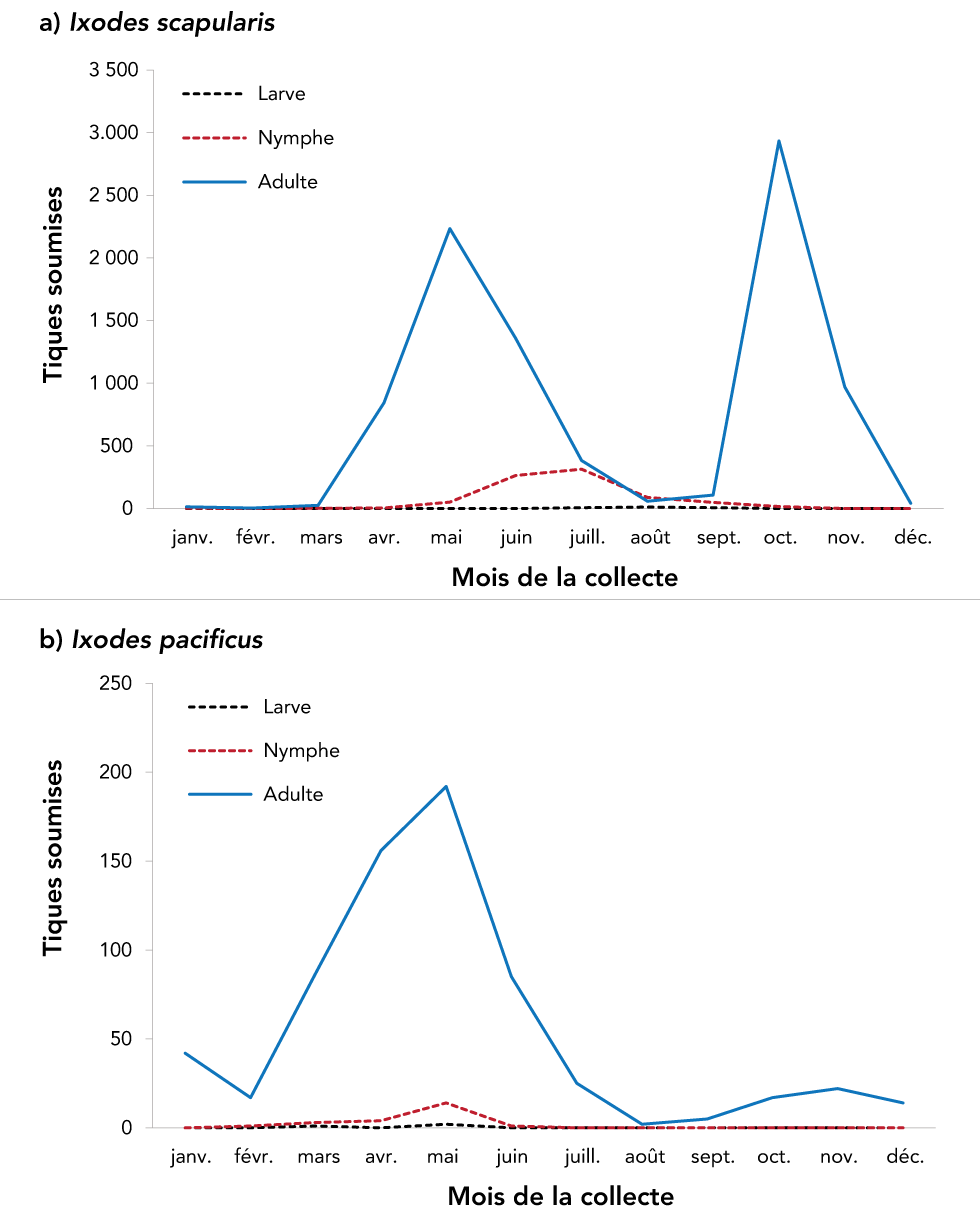Les tiques ont été soumises à une surveillance passive tous les mois, ce qui souligne le risque potentiel, tout au long de l'année (en fonction du lieu et du temps), d'exposition à des tiques, qui peuvent ou non être infectées par un ou plusieurs agents pathogènes transmis par les tiques. Les tiques Ixodes spp., par exemple, étaient souvent trouvées dans l'ouest du Canada en hiver, mais étaient rarement infectéesNote de bas de page 23. Le pic unique de soumissions de tiques I. pacificus au printemps a été historiquement observé en Colombie-BritanniqueNote de bas de page 23 et dans l'ouest des États-UnisNote de bas de page 30, car les nymphes et les adultes sont actives pendant les mois plus frais du printempsNote de bas de page 31. Des pics bimodaux pour les I. scapularis adultes à la fin du printemps et à l'automne ont déjà été observés dans le centre et l'est du CanadaNote de bas de page 3Note de bas de page 16Note de bas de page 32, et correspondent à l'activité des tiques I. scapularis adultes dans un cycle de vie de trois à quatre ans prolongé, en partie, par des températures printanières plus fraîchesNote de bas de page 31Note de bas de page 33. Les nymphes de ces deux espèces, qui sont les plus impliquées dans la transmission de la MLNote de bas de page 34, atteignent leur apogée à la fin du printemps et en été, au moment où l'apparition de la ML chez l'homme est également maximaleNote de bas de page 9.