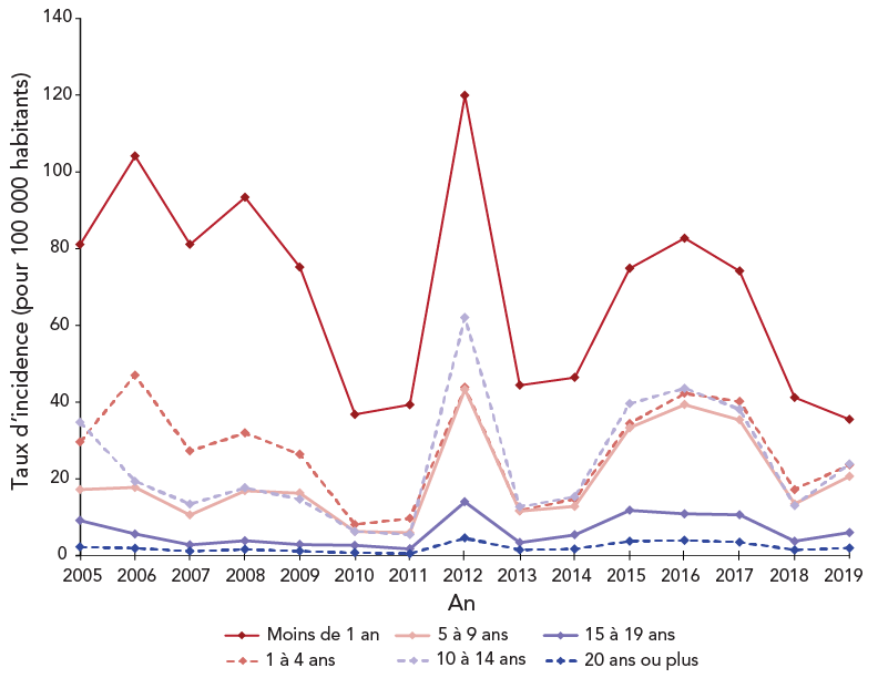 Des sommets sporadiques de l'incidence de la coqueluche ont été observés dans chaque région géographique. Bien que les données disponibles sur les cas de coqueluche ne comprennent pas de renseignements sur les éclosions, les sommets de l'incidence dans une région géographique peuvent être liés à des éclosions survenant au niveau régional. Par exemple, en 2012, une augmentation de 55 fois du taux d'incidence dans la région de l'Atlantique a été associée à une importante éclosion déclarée au Nouveau-Brunswick, mettant en cause 1 421 cas confirmés, dont 2 % des cas ont été hospitalisés. Plus de la moitié des cas visaient des enfants d'âge scolaire, alors que le groupe d'âge de 10 à 14 ans, suivi du groupe d'âge de cinq à neuf ans, avait les taux les plus élevés d'incidence selon l'âge. Des campagnes d'immunisation dans les écoles tenues à l'échelle de la province ont été mises en œuvre au printemps et à l'automne 2012 pour combattre cette importante épidémie Note de bas de page 17. De 2005 à 2019, les sommets les plus hauts régionaux en termes d'incidence ont été observés dans la région du Nord, ce qui peut être attribué à de grandes éclosions qui ont été accentuées par la plus faible population des territoires par rapport aux autres régions géographiques. L'augmentation en flèche de l'incidence, dans la région du Nord en 2016 et 2017, a été liée à une importante éclosion au Nunavut, survenue de mai 2016 à avril 2017, qui s'est étendu à 11 collectivités pour laquelle 163 cas ont été confirmés, et une deuxième éclosion plus petite qui s'est produite de septembre à novembre 2017 Note de bas de page 6 Note de bas de page 18. Des années de sommets sporadiques dans l'activité de la coqueluche ont été signalées dans d'autres pays, dont les États-Unis, la Grèce, la Finlande et Singapour, pour n'en citer que quelques-unes, au cours des dernières décennies Note de bas de page 19 Note de bas de page 20. Dans des études, on a émis l'hypothèse que la nature cyclique de cette maladie pourrait être attribuable à un faible nombre de vaccinations, à une diminution de l'immunité vaccinale et à des changements du Bordetella pertussis Note de bas de page 21 Note de bas de page 22 Note de bas de page 23.