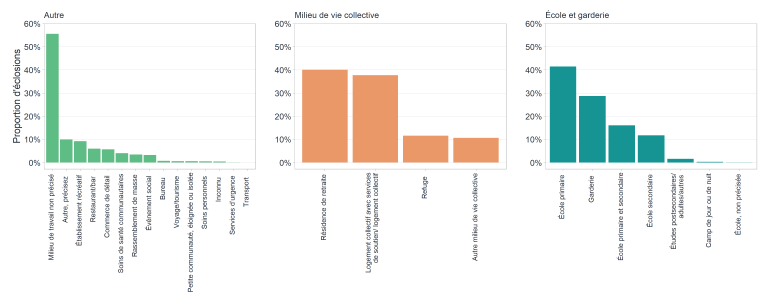 | Autre | Soins de santé communautaire, services d'urgence, rassemblement de masse, bureau, soins personnels, établissement récréatif, restaurant/bar, commerce de détail, événement social, transport, voyage/tourisme, autre, milieu de travail non précisé, milieu inconnu |