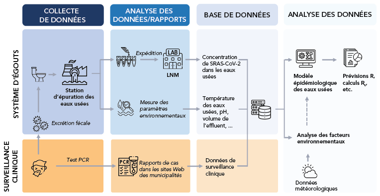 Si une fraction des infections cliniques par le SRAS-CoV-2 sont asymptomatiques et peuvent passer inaperçues dans le cadre de la surveillance clinique traditionnelle, l'excrétion fécale se produit vraisemblablement chez la plupart des personnes infectées. Ces deux types d'événements, les manifestations symptomatiques et l'excrétion fécale, sont à l'origine de deux flux de données : les données cliniques et les eaux usées. À l'Agence de la santé publique du Canada/au Laboratoire national de microbiologie, les eaux usées sont échantillonnées à la station d'épuration, couvrant généralement une grande population. Les tests PCR quantitatifs en temps réel des cas cliniques sont généralement effectués sur une multitude d'échantillons cliniques afin d'évaluer le statut infectieux des personnes testées, tandis que les eaux usées évaluent la concentration du SRAS-CoV-2 dans un seul échantillon afin de fournir une approximation de la prévalence au niveau de la communauté. Alors que la surveillance clinique peut être biaisée et manquer des groupes démographiques entiers, le signal des eaux usées peut être affecté par des variables environnementales indépendantes de l'éclosion (e.g. la température, les déchets industriels, les conditions météorologiques). Les flux de données cliniques et d'eaux usées peuvent être liés en utilisant le code postal des cas signalés et les cartes d'eaux usées des lieux d'échantillonnage. Les données sont sauvegardées dans une base de données dans un format standardisé pour les différentes municipalités du Canada afin d'assurer l'évolutivité de l'analyse des données. Cette base de données est ensuite utilisée pour adapter les modèles épidémiques afin d'estimer les variables non observées (e.g. le nombre de reproduction Rt) et d'effectuer des prévisions à court terme.