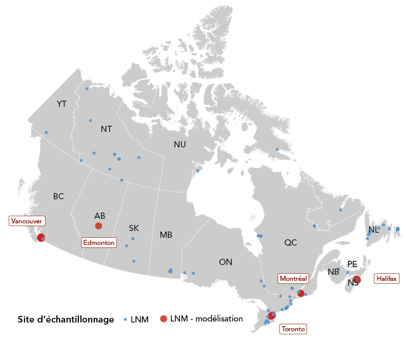 Bien que le cadre actuel utilise les données de cinq villes - Vancouver, Edmonton, Toronto, Montréal et Halifax - qui sont utilisées pour le modèle épidémiologique des eaux usées afin de fournir des prévisions de cas (points rouges), le pipeline de surveillance basée sur les eaux usées a le potentiel de s'étendre à d'autres villes et de fournir des tendances et/ou des prévisions du SRAS-CoV-2 à travers le Canada avec l'incorporation de programmes de surveillance basée sur les eaux usées concomitants. L'emplacement de ces programmes de surveillance basée sur les eaux usées, menés par le LNM, les institutions académiques et les collaborateurs du LNM, est représenté graphiquement pour visualiser la couverture totale de surveillance basée sur les eaux usées pour la COVID-19 au Canada en juin 2022 (points bleus et rouges). Certains sites d'échantillonnage du LNM ne sont pas inclus dans la carte en raison des politiques de confidentialité (source : Agence de la santé publique du Canada).