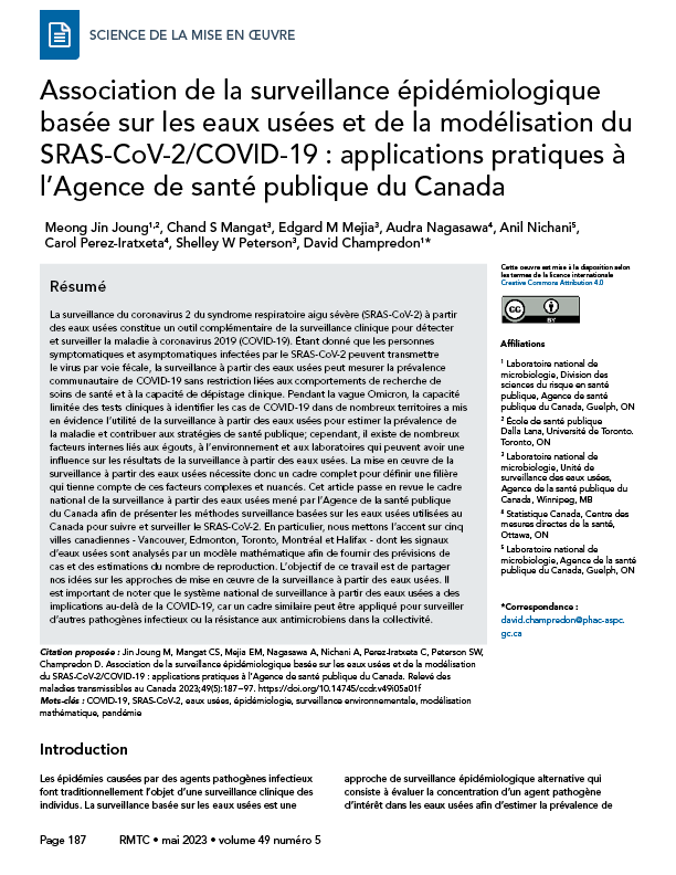 Jin Joung M, Mangat CS, Mejia EM, Nagasawa A, Nichani A, Perez-Iratxeta C, Peterson SW, Champredon D. Association de la surveillance épidémiologique basée sur les eaux usées et de la modélisation du SRAS-CoV-2/COVID-19 : applications pratiques à l'Agence de santé publique du Canada. Relevé des maladies transmissibles au Canada 2023;49(5):187–97. https://doi.org/10.14745/ccdr.v49i05a01f