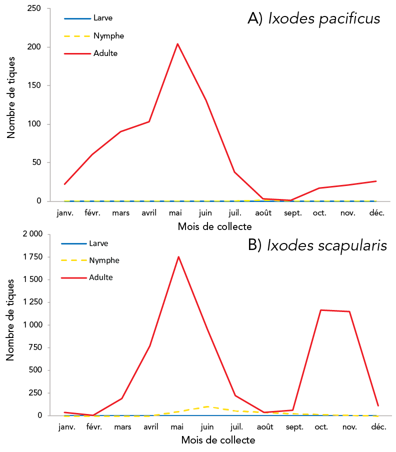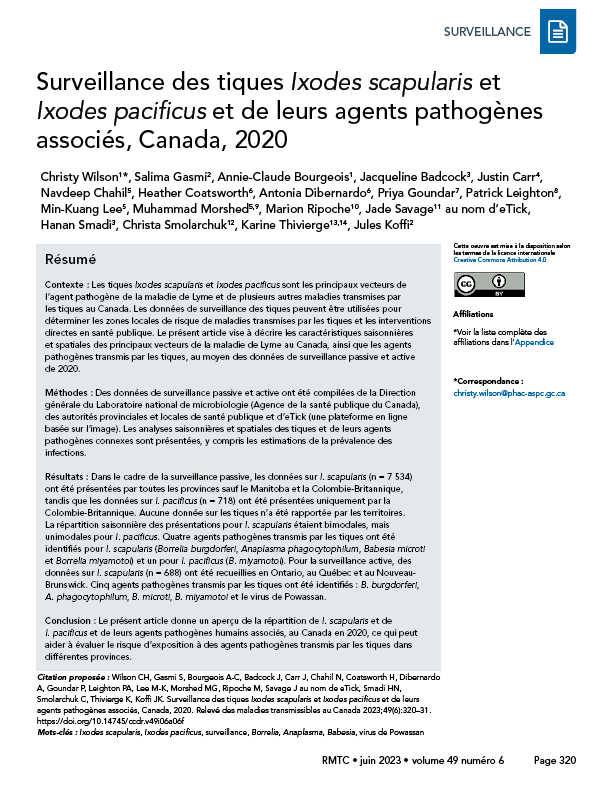 Wilson CH, Gasmi S, Bourgeois A-C, Badcock J, Carr J, Chahil N, Coatsworth H, Dibernardo A, Goundar P, Leighton PA, Lee M-K, Morshed MG, Ripoche M, Savage J au nom de eTick, Smadi HN, Smolarchuk C, Thivierge K, Koffi JK. Surveillance des tiques Ixodes scapularis et Ixodes pacificus et de leurs agents pathogènes associés, Canada, 2020. Relevé des maladies transmissibles au Canada 2023;49(6):320–31. https://doi.org/10.14745/ccdr.v49i06a06f