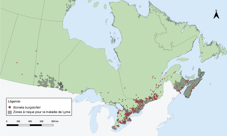 Cette carte montre l’emplacement probable de l’acquisition des tiques Ixodes scapularis soumises par surveillance passive qui ont été infectées par Borrelia burgdorferi. La carte montre également les zones à risque pour la maladie de Lyme. On trouve à des degrés divers des tiques infectées en Saskatchewan, en Ontario, au Québec, à Terre-Neuve-et-Labrador, au Nouveau-Brunswick et en Nouvelle-Écosse. La plupart des tiques infectées se trouvent dans le Sud de l’Ontario et du Québec.