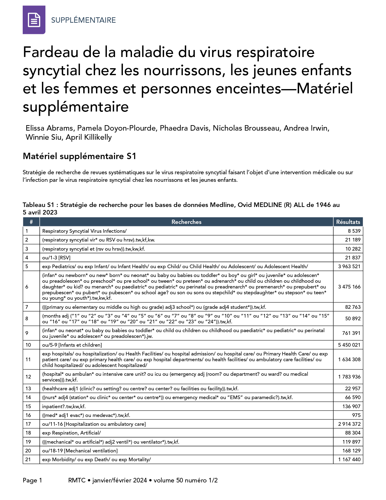 - Tableau S1 : Stratégie de recherche pour les bases de données Medline, Ovid MEDLINE (R) ALL de 1946 au 5 avril 2023