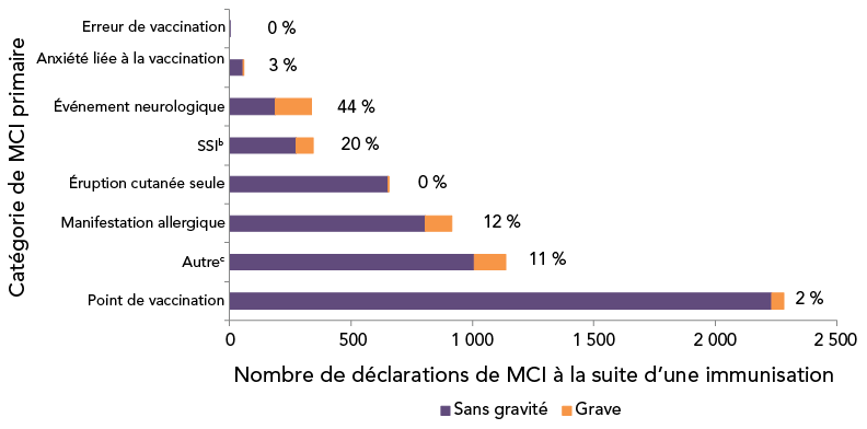 Le tableau 1 présente une ventilation des motifs de soumission d'une déclaration de MCI grave à la suite d'une immunisation pour chaque sous-catégorie de MCI et pour la catégorie globale est indiqué dans le tableau. Les réactions au point de vaccination ont été la MCI à la suite d'une immunisation la plus fréquemment signalée (n = 2 283, 40 %), suivies par les manifestations allergiques ou de type allergique (n = 915, 16 %) et les éruptions cutanées (n = 653, 11 %). Ces trois catégories combinées représentent 67 % de toutes les MCI à la suite d'une immunisation et 14 % de toutes les déclarations d'EIG soumises en 2018–2019. La figure 4 montre que la proportion d'événements graves est la plus élevée dans la catégorie des événements neurologiques (44 %), suivie par celle des infections/syndromes/symptômes systémiques (20 %). Il convient de noter qu'une seule déclaration faisait état d'erreurs de vaccination, ce qui ne constituait pas un événement grave. Toutes les déclarations de MCI à la suite d'une immunisation ont fait l'objet d'un examen médical.