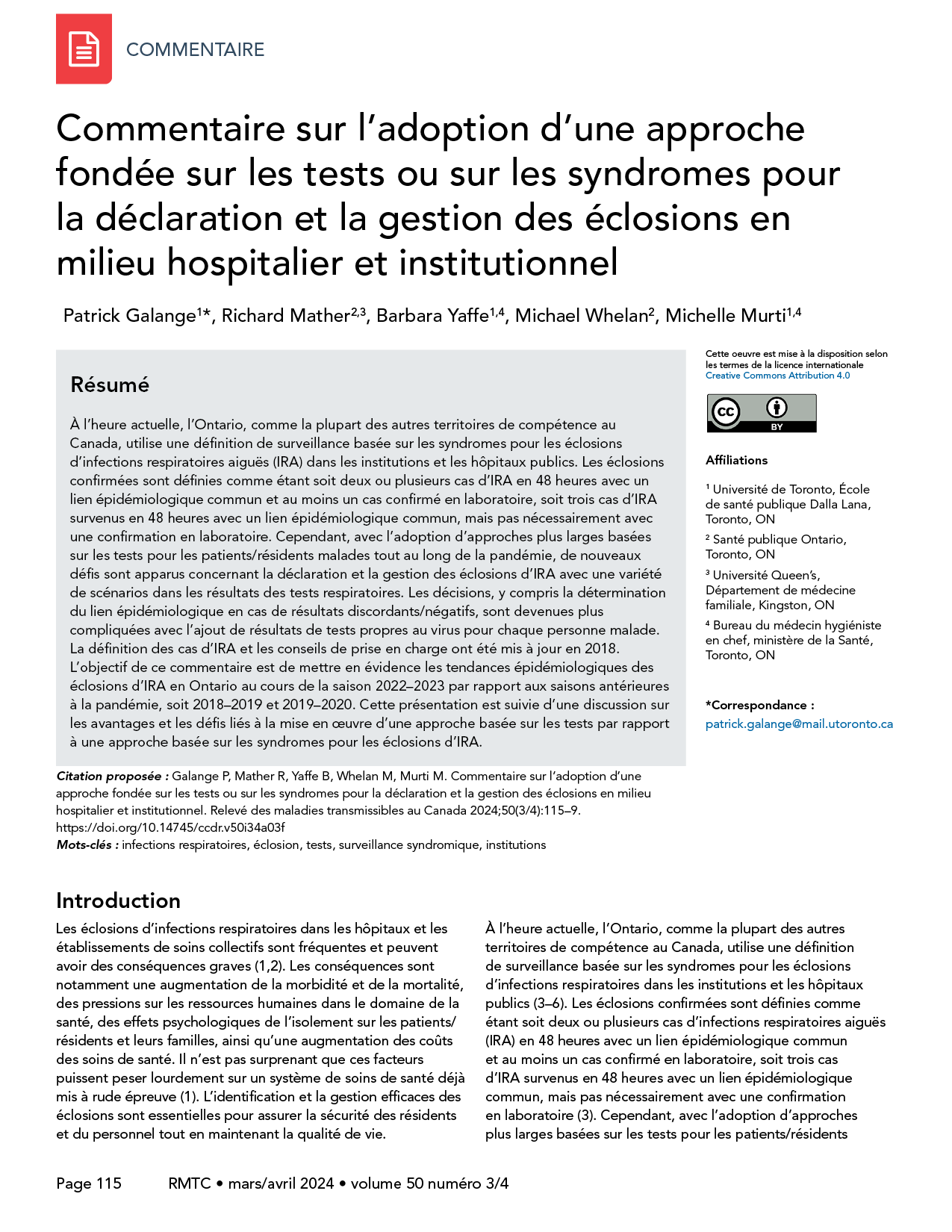 Galange P, Mather R, Yaffe B, Whelan M, Murti M. Commentaire sur l'adoption d'une approche fondée sur les tests ou sur les syndromes pour la déclaration et la gestion des éclosions en milieu hospitalier et institutionnel. Relevé des maladies transmissibles au Canada 2024;50(3/4):115–9. https://doi.org/10.14745/ccdr.v50i34a03f