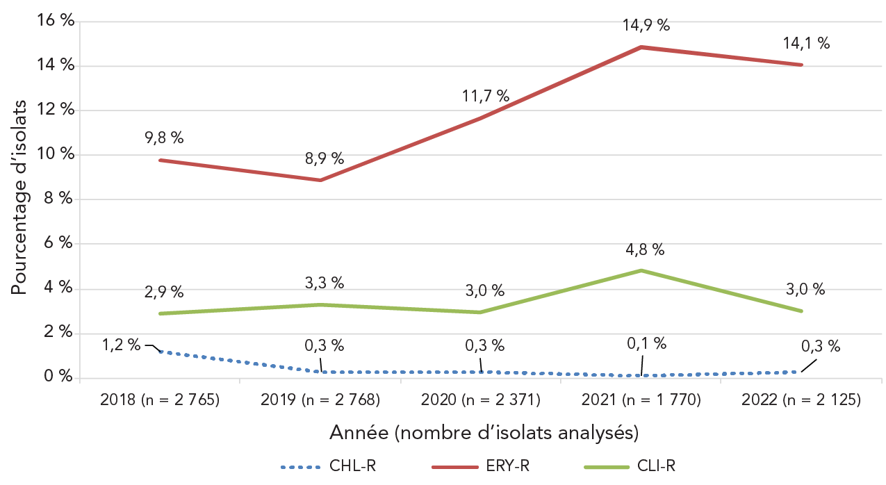 Cette figure est un graphique linéaire affichant le pourcentage de tous les isolats invasifs de Streptococcus pyogenes déterminés comme étant résistants à la clarithromycine, à la clindamycine et au chloramphénicol chaque année, de 2018 à 2022.