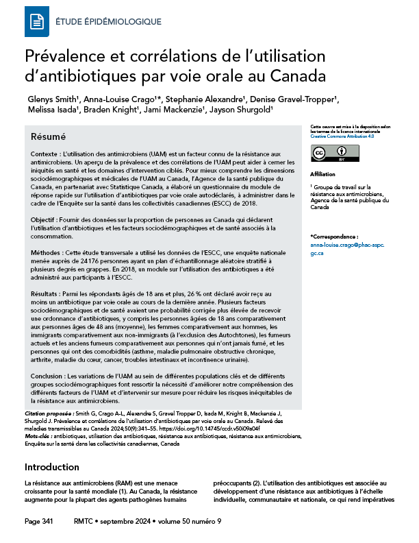 Smith G, Crago A-L, Alexandre S, Gravel Tropper D, Isada M, Knight B, Mackenzie J, Shurgold J. Prévalence et corrélations de l'utilisation d'antibiotiques par voie orale au Canada. Relevé des maladies transmissibles au Canada 2024;50(9):341–55. https://doi.org/10.14745/ccdr.v50i09a04f