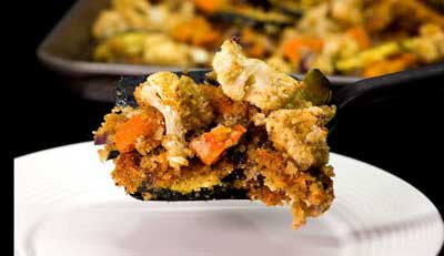 - Étendre uniformément les légumes enrobés sur une plaque à pâtisserie tapissée de papier parchemin (ou graissée).