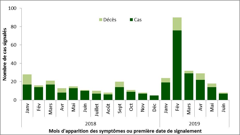 Remarque : Ce graphique a été préparé par le Centre de l'immunisation et des maladies respiratoires infectieuses (CIMRI) à partir des données des Bulletins sur les flambées épidémiques de l'OMS et du ministère de la Santé de l'Arabie saoudite. Il reflète les données disponibles le 30 juin 2019.