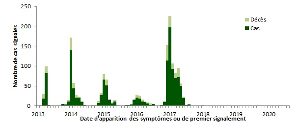 La distribution temporelle de la grippe aviaire A(H7N9) à l'échelle mondiale, du 1e janvier 2013 au 31 août 2020, est présentée sur la Figure 1. L'année 2017 comprend le plus grand nombre de signalements avec un pic atteint en janvier. Trois cas ont été signalés en 2018 et un cas a été signalé en 2019.