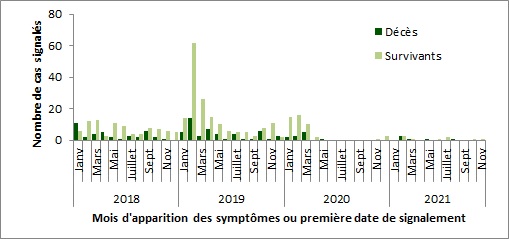 Remarque : Ce graphique a été préparé par le Centre de l'immunisation et des maladies respiratoires infectieuses (CIMRI) à partir des données des Bulletins sur les flambées épidémiques de l'OMS et du ministère de la Santé de l'Arabie saoudite. Il reflète les données disponibles le 30 novembre 2021.