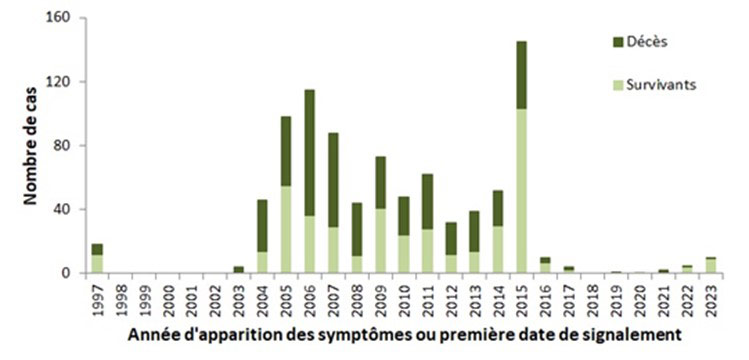 | Année | Nombre de cas | Décès | Survivant |