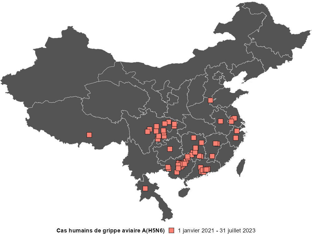 Un (1) nouveau cas humain d'A(H5N6) a été signalé en juillet 2023 en Chine. Le cas concernait un homme de 64 ans retraité de la province de Guangxi qui est tombé malade le 4 juillet 2023 et qui se trouvait dans un état grave au moment du dernier rapport. Il a déclaré avoir été exposé à de la volaille domestique vivante, mais les échantillons environnementaux prélevés aux fins d'analyses se sont révélés négatifs.