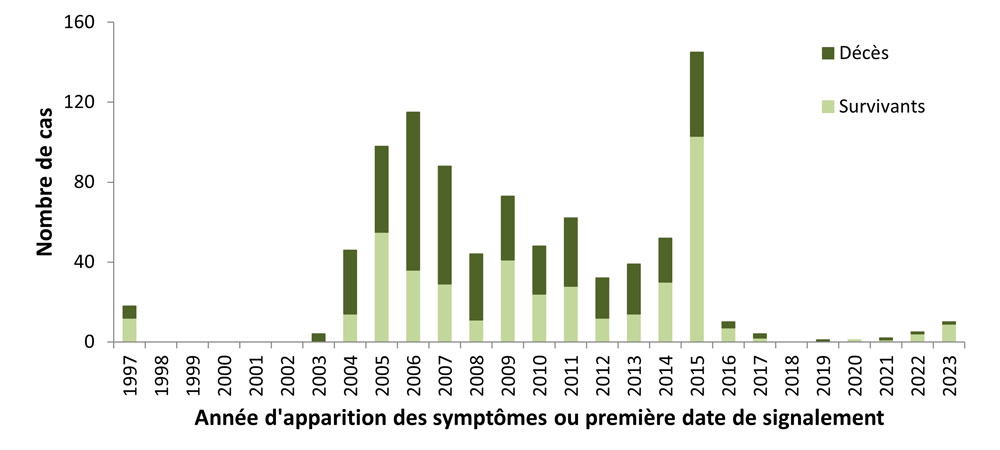 En 2023, sept cas de SRMO-CoV ont été détectés. Un total de 2 605 cas de SRMO-CoV confirmés en laboratoire, dont 937 décès, ont été signalés dans le monde depuis 2012 par l'OMS (TL : 36 %). Aucun cas n'a été signalé au Canada.