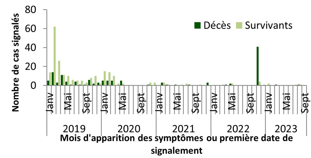Remarque : Ce graphique a été préparée par le CIERPP à partir des données du site d'information sur les événements de l'OMS, du CDC HAN des États-Unis et du décompte cumulatif des cas de l'OMS. Elle reflète les données disponibles dans ces publications en date du 30 septembre 2023.