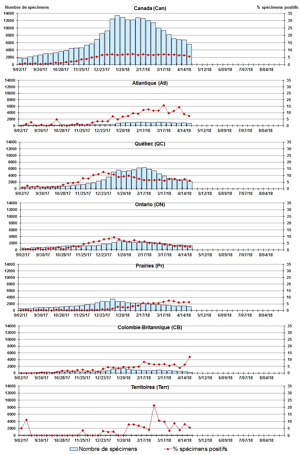 Les échantillons du Yukon (Yn), des Territoires du Nord-Ouest (T.N.-O.) et du Nunavut (Nt) sont envoyés à des laboratoires de référence dans d'autres provinces. Les résultats soumis reflètent les données des spécimens des provinces et territoires suivants : Yn, T.N.-O. et Nt. Certains délais quant à la soumission des rapports peuvent affecter les données de façon rétrospective. |