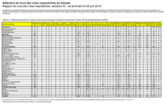 Tableau 1 : Détection/isolement de virus des voies respiratoires pour la semaine se terminant le 9 juin 2018 (Code hebdomadaire 201823)