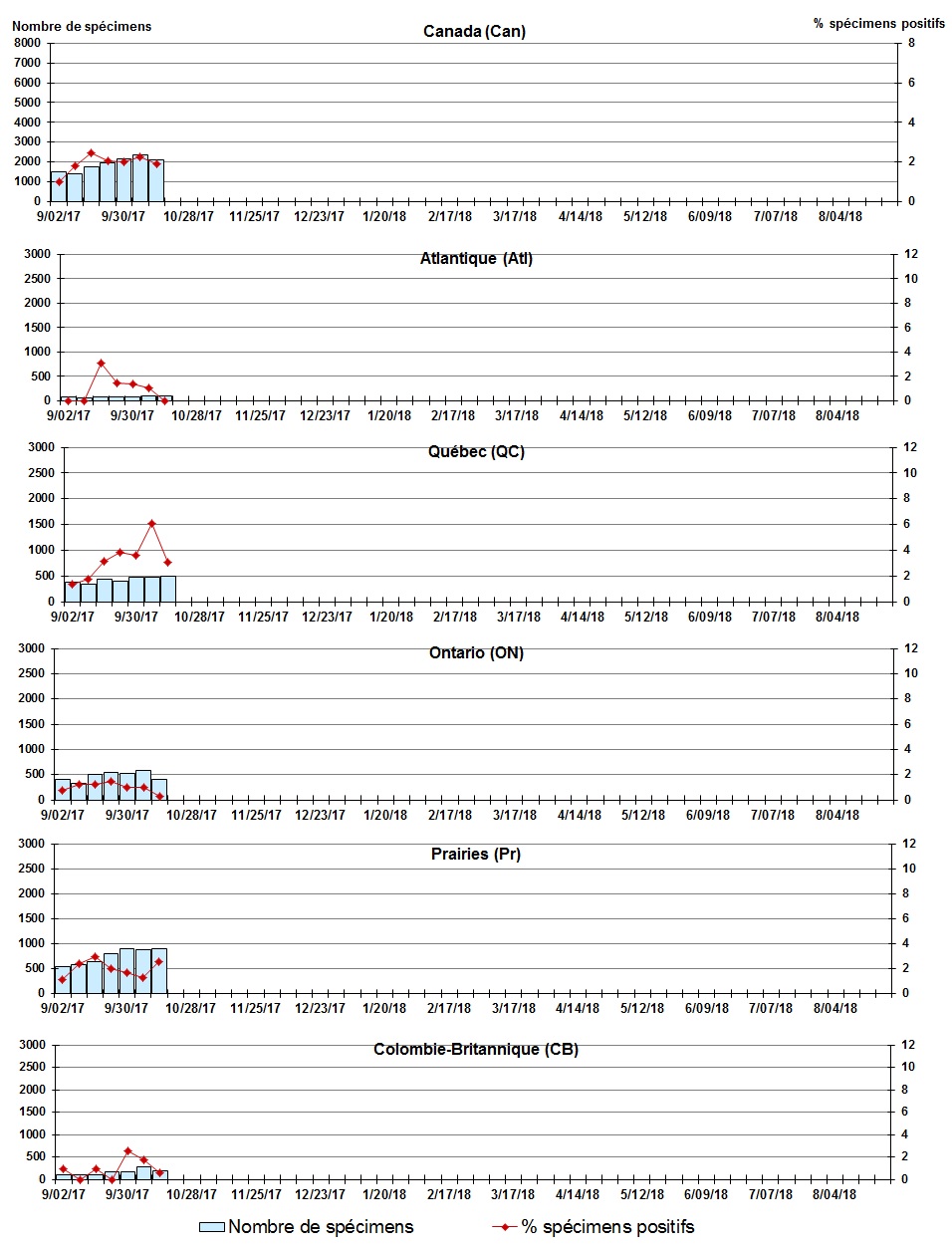 Les échantillons du Yukon (Yn), des Territoires du Nord-Ouest (T.N.-O.) et du Nunavut (Nt) sont envoyés à des laboratoires de référence dans d'autres provinces. Les résultats soumis reflètent les données des spécimens des provinces et territoires suivants : Yn, T.N.-O. et Nt. |