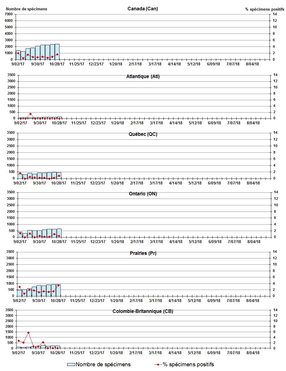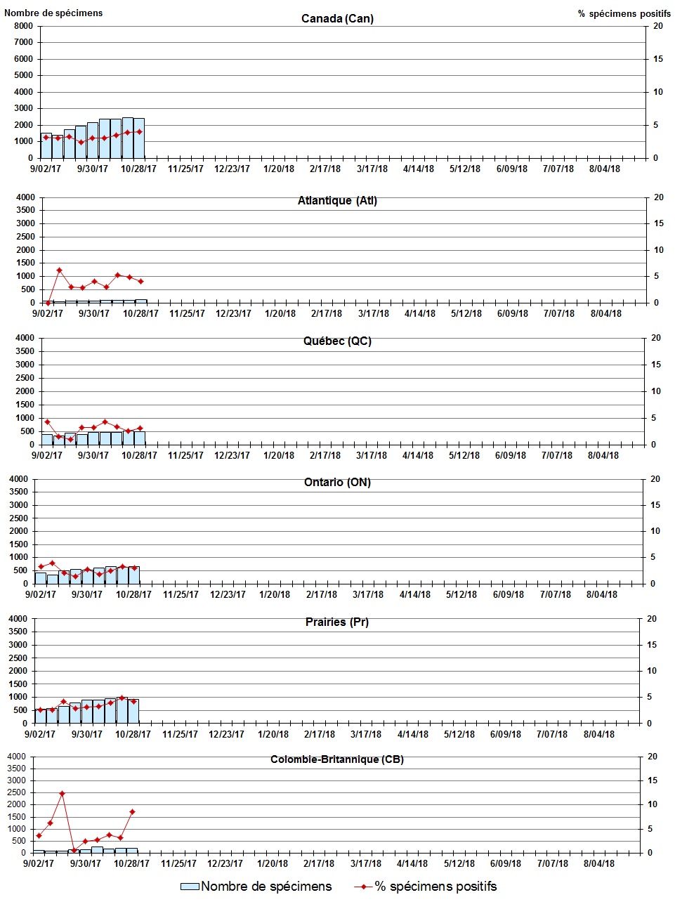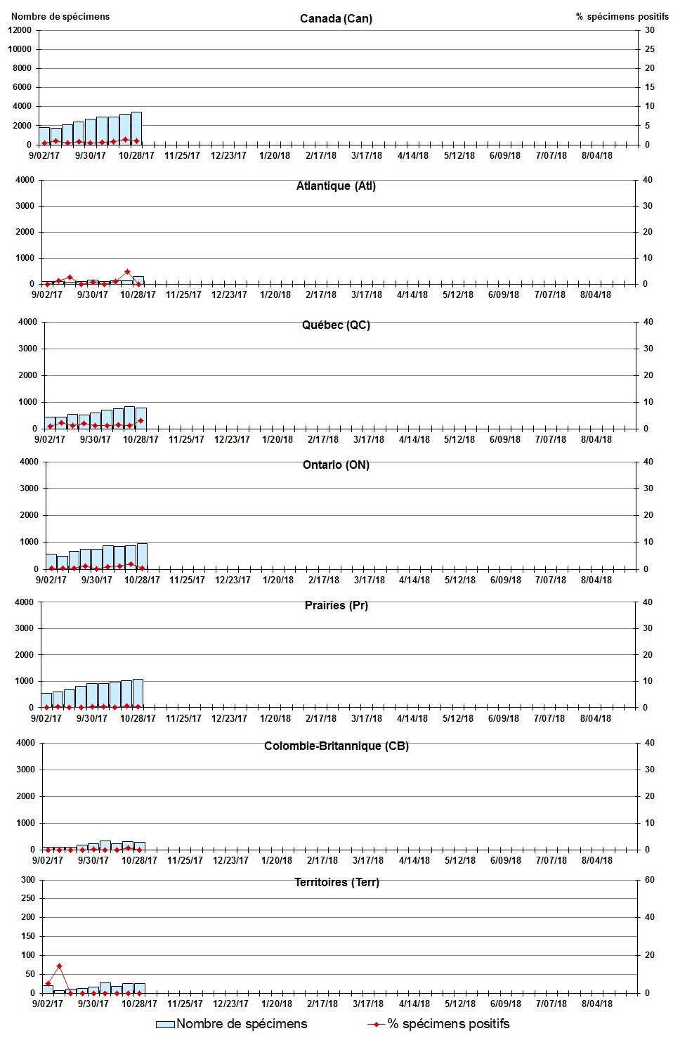 Les échantillons du Yukon (Yn), des Territoires du Nord-Ouest (T.N.-O.) et du Nunavut (Nt) sont envoyés à des laboratoires de référence dans d'autres provinces. Les résultats rapportés pour les territoires reflètent le nombre des spécimens identifiés comme provenant du Yn, T.N.-O. et Nt. Certains délais quant à la soumission des rapports peuvent affecter les données de façon rétrospective. Par conséquent, en raison des retards des rapports, la somme des totaux hebdomadaires ne correspond pas au total cumulatif. |