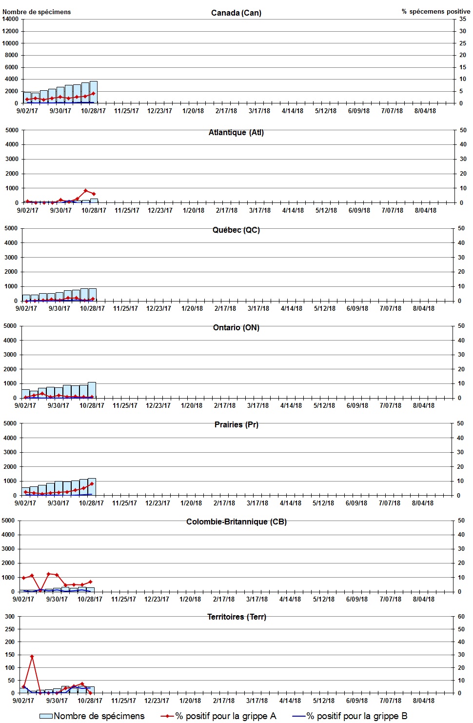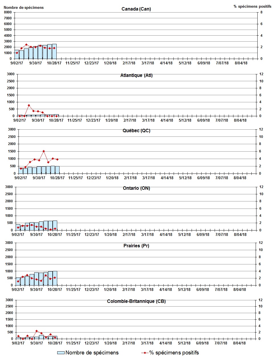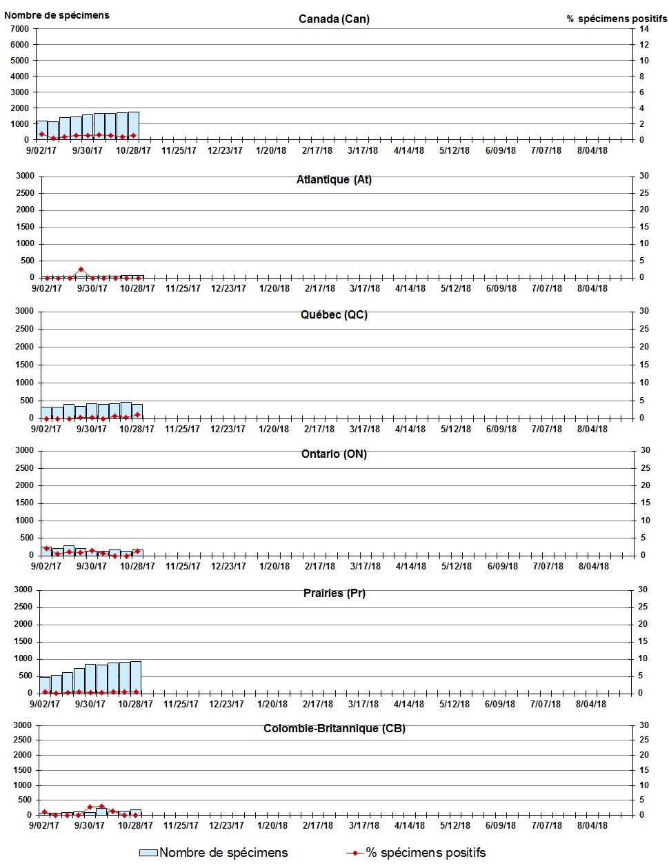 Les échantillons du Yukon (Yn), des Territoires du Nord-Ouest (T.N.-O.) et du Nunavut (Nt) sont envoyés à des laboratoires de référence dans d'autres provinces. Les résultats rapportés pour les territoires reflètent le nombre des spécimens identifiés comme provenant du Yn, T.N.-O. et Nt. Certains délais quant à la soumission des rapports peuvent affecter les données de façon rétrospective. Par conséquent, en raison des retards des rapports, la somme des totaux hebdomadaires ne correspond pas au total cumulatif. |