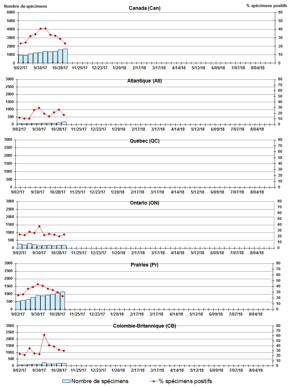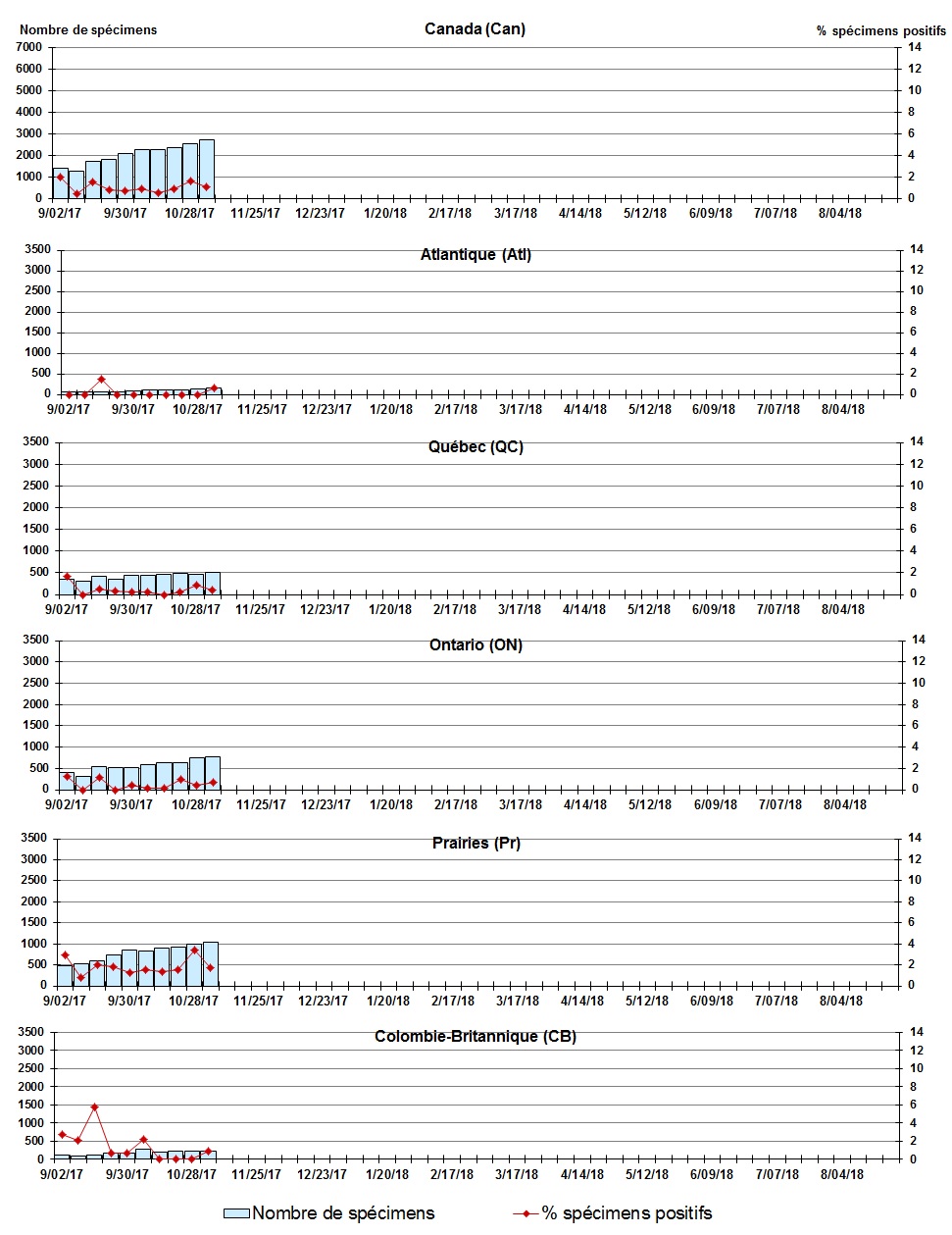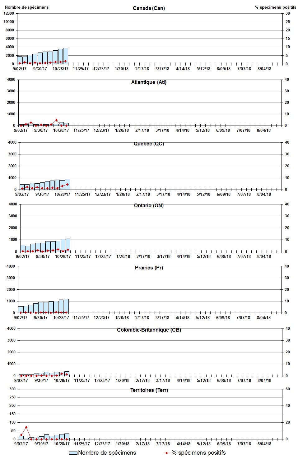 Les échantillons du Yukon (Yn), des Territoires du Nord-Ouest (T.N.-O.) et du Nunavut (Nt) sont envoyés à des laboratoires de référence dans d'autres provinces. Les résultats rapportés pour les territoires reflètent le nombre des spécimens identifiés comme provenant du Yn, T.N.-O. et Nt. Certains délais quant à la soumission des rapports peuvent affecter les données de façon rétrospective. Par conséquent, en raison des retards des rapports, la somme des totaux hebdomadaires ne correspond pas au total cumulatif. |