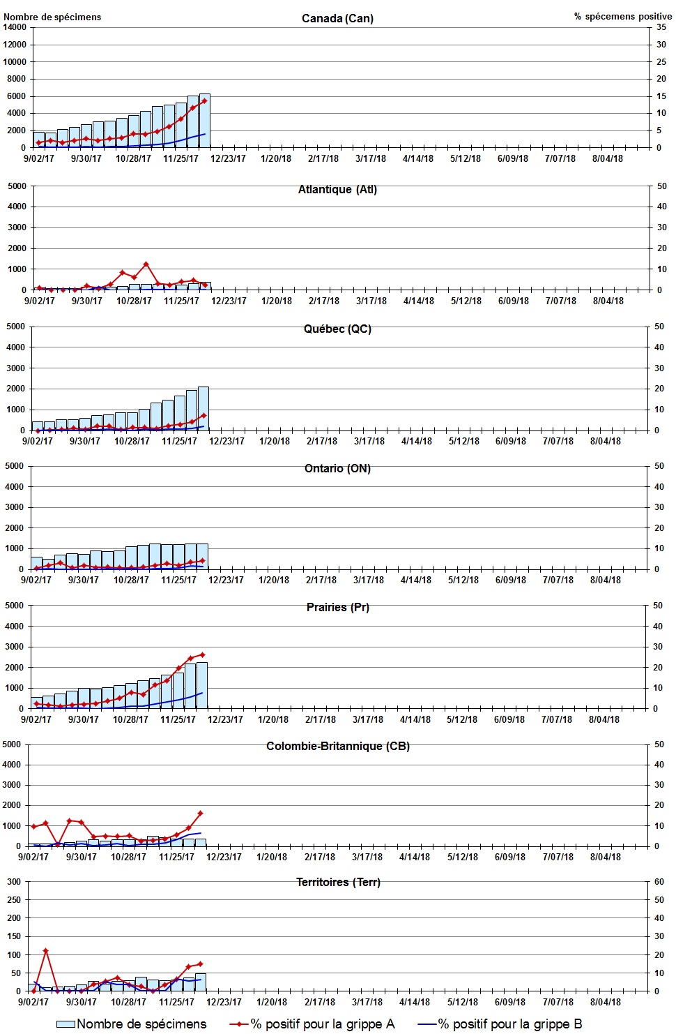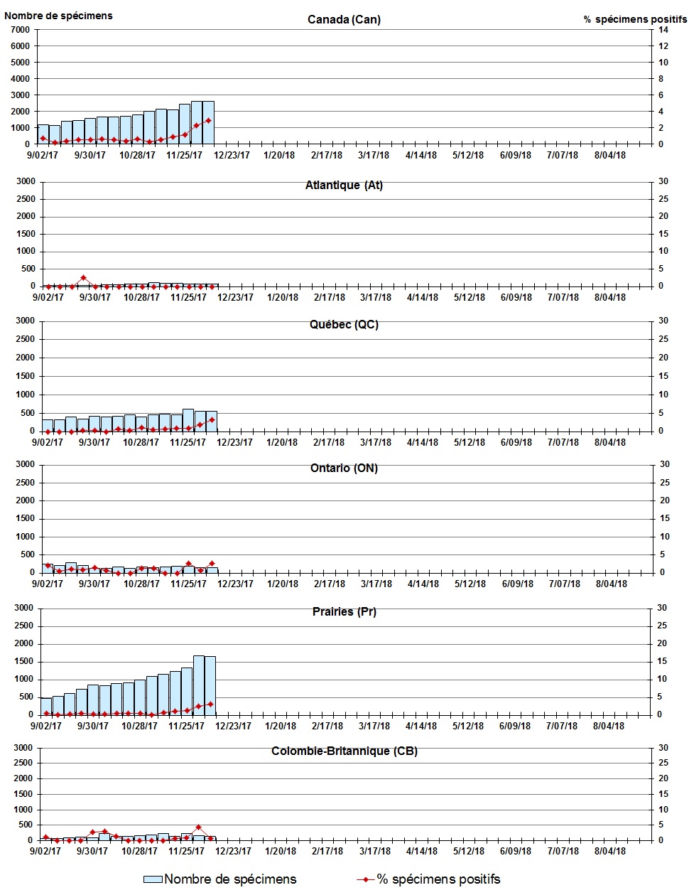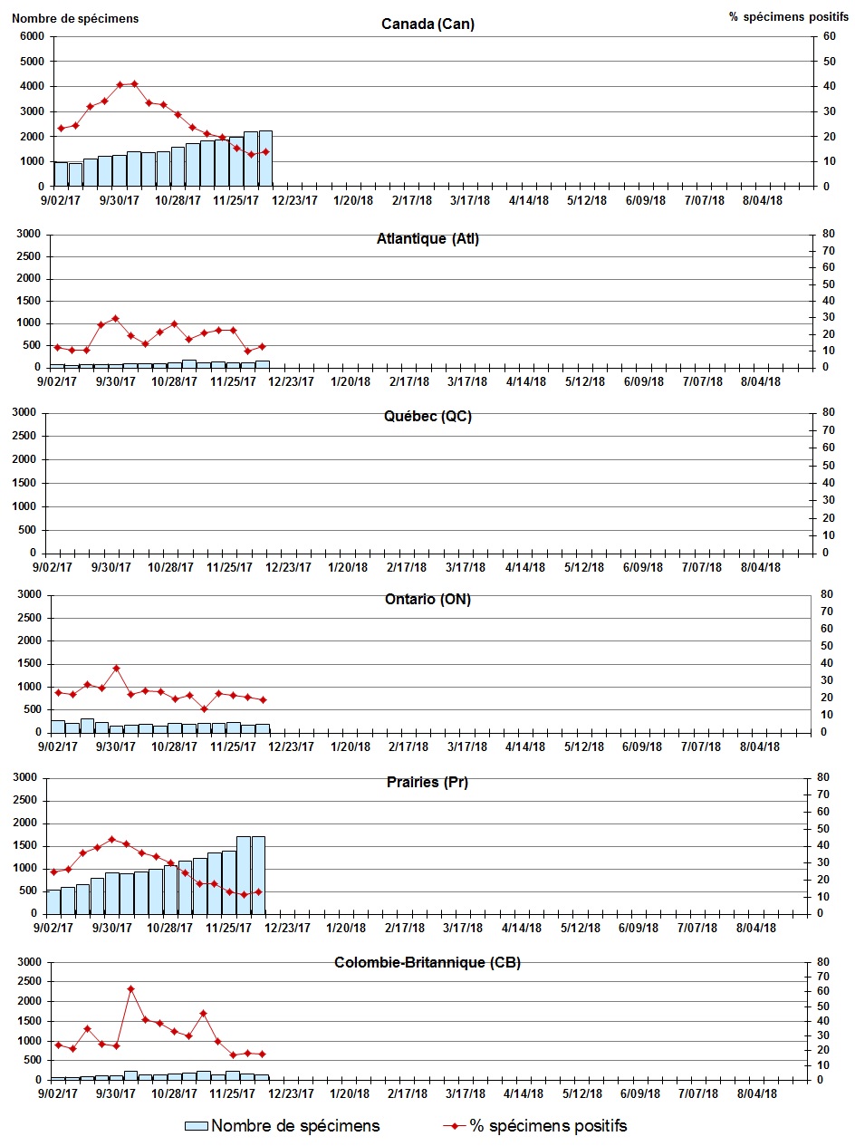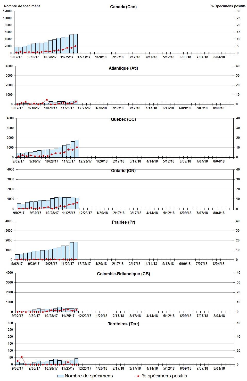 Les échantillons du Yukon (Yn), des Territoires du Nord-Ouest (T.N.-O.) et du Nunavut (Nt) sont envoyés à des laboratoires de référence dans d'autres provinces. Les résultats rapportés pour les territoires reflètent le nombre des spécimens identifiés comme provenant du Yn, T.N.-O. et Nt. Certains délais quant à la soumission des rapports peuvent affecter les données de façon rétrospective. Par conséquent, en raison des retards des rapports, la somme des totaux hebdomadaires ne correspond pas au total cumulatif. |