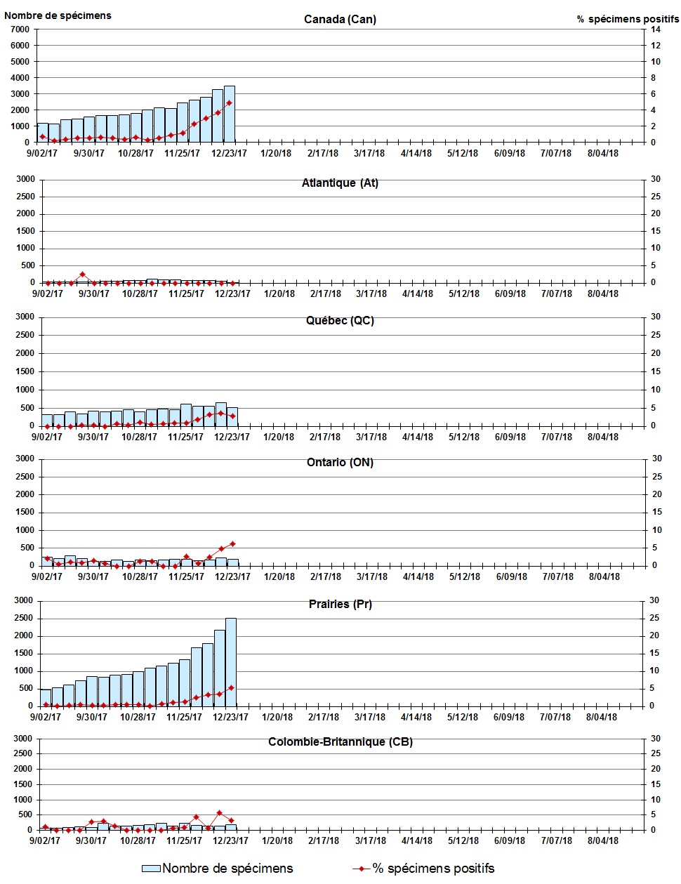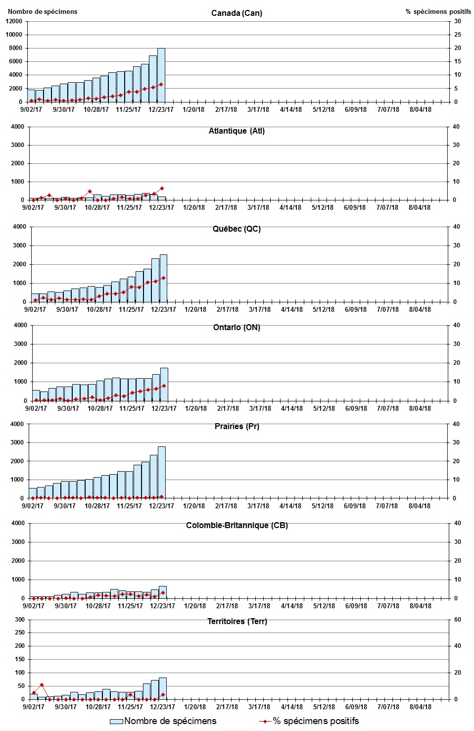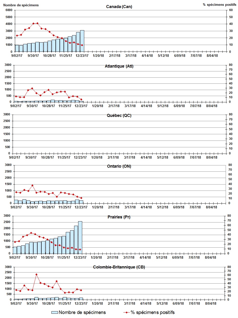 Les échantillons du Yukon (Yn), des Territoires du Nord-Ouest (T.N.-O.) et du Nunavut (Nt) sont envoyés à des laboratoires de référence dans d'autres provinces. Les résultats rapportés pour les territoires reflètent le nombre des spécimens identifiés comme provenant du Yn, T.N.-O. et Nt. Certains délais quant à la soumission des rapports peuvent affecter les données de façon rétrospective. Par conséquent, en raison des retards des rapports, la somme des totaux hebdomadaires ne correspond pas au total cumulatif. |