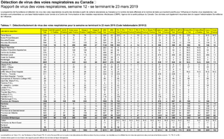 Tableau 1 : Détection/isolement de virus des voies respiratoires pour la semaine se terminant le 23 mars 2019 (Code hebdomadaire 201912)