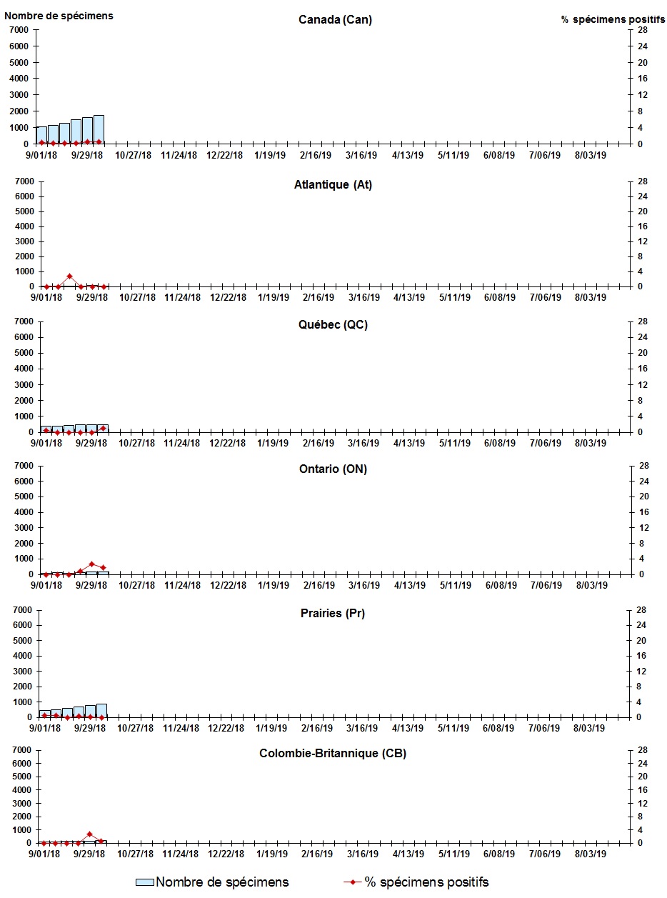 Les échantillons du Yukon (Yn), des Territoires du Nord-Ouest (T.N.-O.) et du Nunavut (Nt) sont envoyés à des laboratoires de référence dans d'autres provinces. Les résultats soumis reflètent les données des spécimens des provinces et territoires suivants : Yn, T.N.-O. et Nt. Certains délais quant à la soumission des rapports peuvent affecter les données de façon rétrospective. |