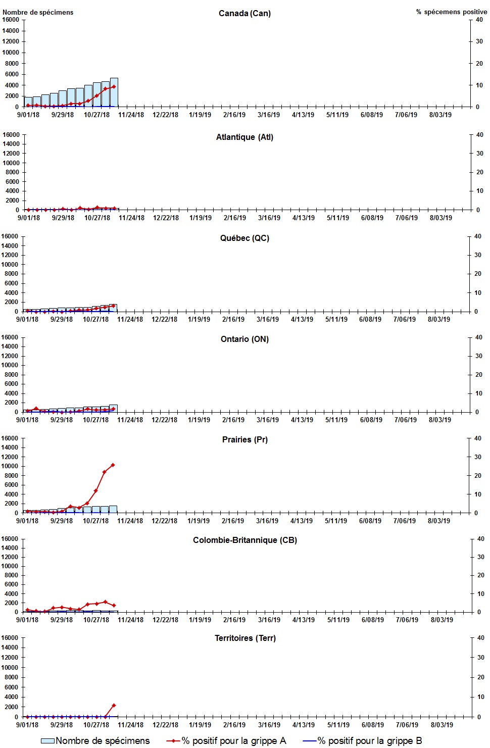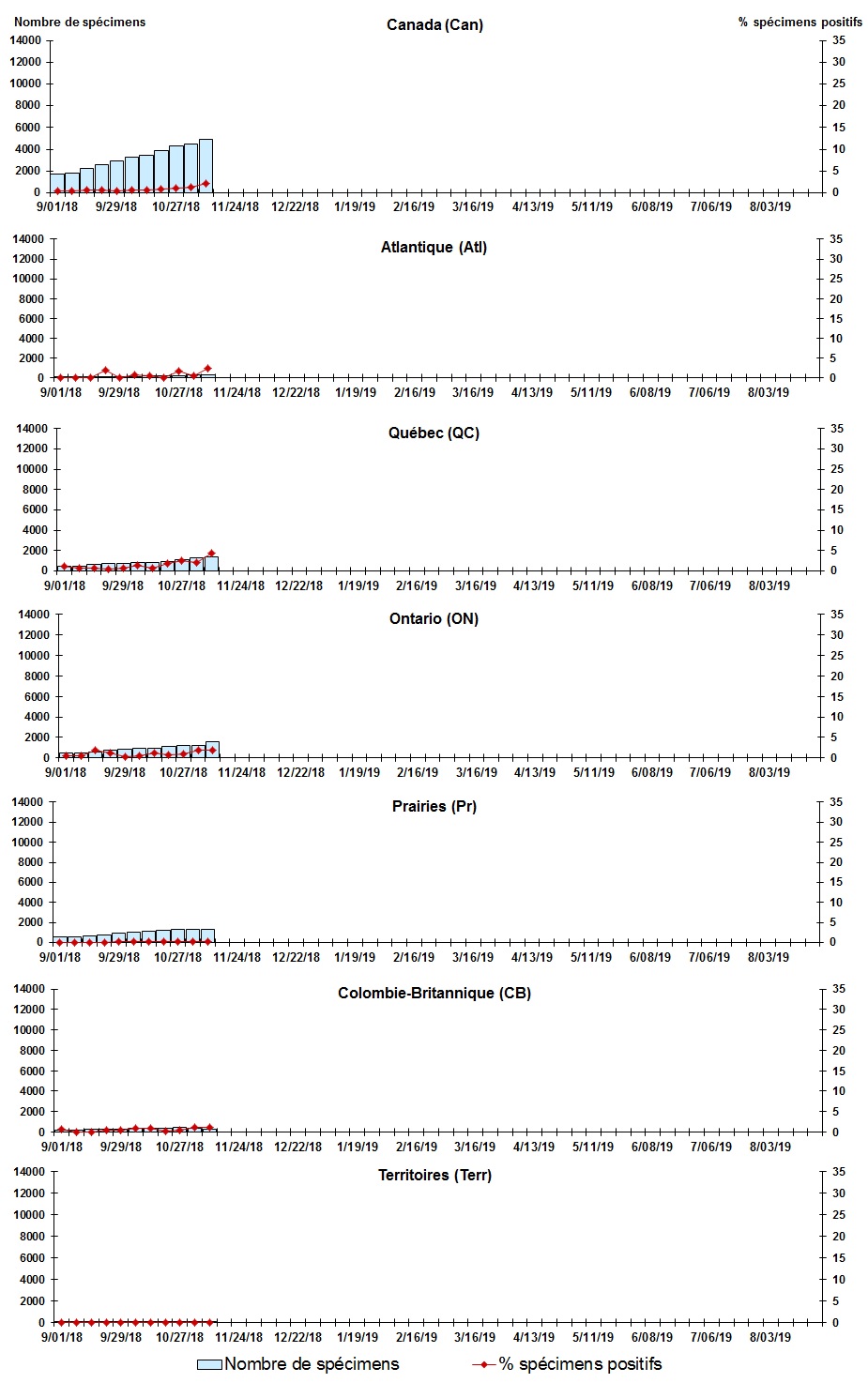 Les échantillons du Yukon (Yn), des Territoires du Nord-Ouest (T.N.-O.) et du Nunavut (Nt) sont envoyés à des laboratoires de référence dans d'autres provinces. Les résultats soumis reflètent les données des spécimens des provinces et territoires suivants : Yn, T.N.-O. et Nt. Certains délais quant à la soumission des rapports peuvent affecter les données de façon rétrospective. |