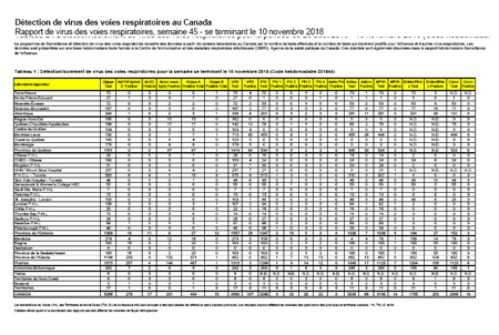 Tableau 1 : Détection/isolement de virus des voies respiratoires pour la semaine se terminant le 10 novembre 2018 (Code hebdomadaire 201845)