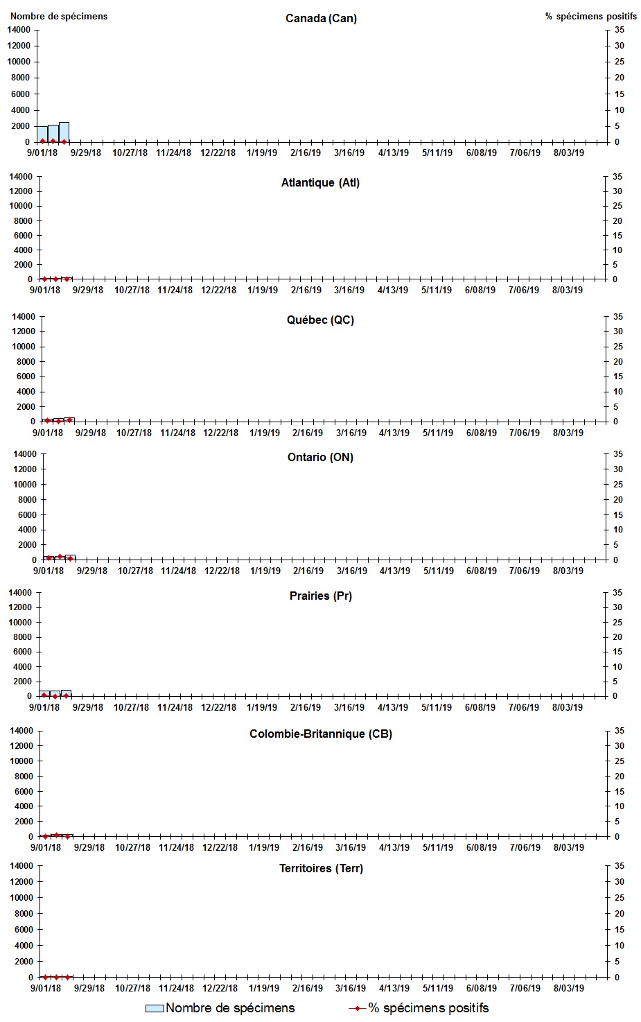 | Semaine | Fin de la semaine | Canada Tests | Entéro/rhino % |