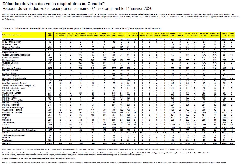 Tableau 1 : Détection/isolement de virus des voies respiratoires pour la semaine se terminant le 11 janvier 2020 (Code hebdomadaire 202002)