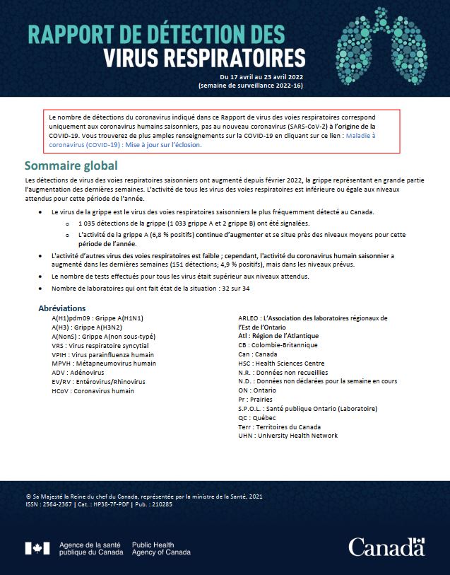 Rapport de virus des voies respiratoires, semaine 16 : se terminant le 23 avril 2022