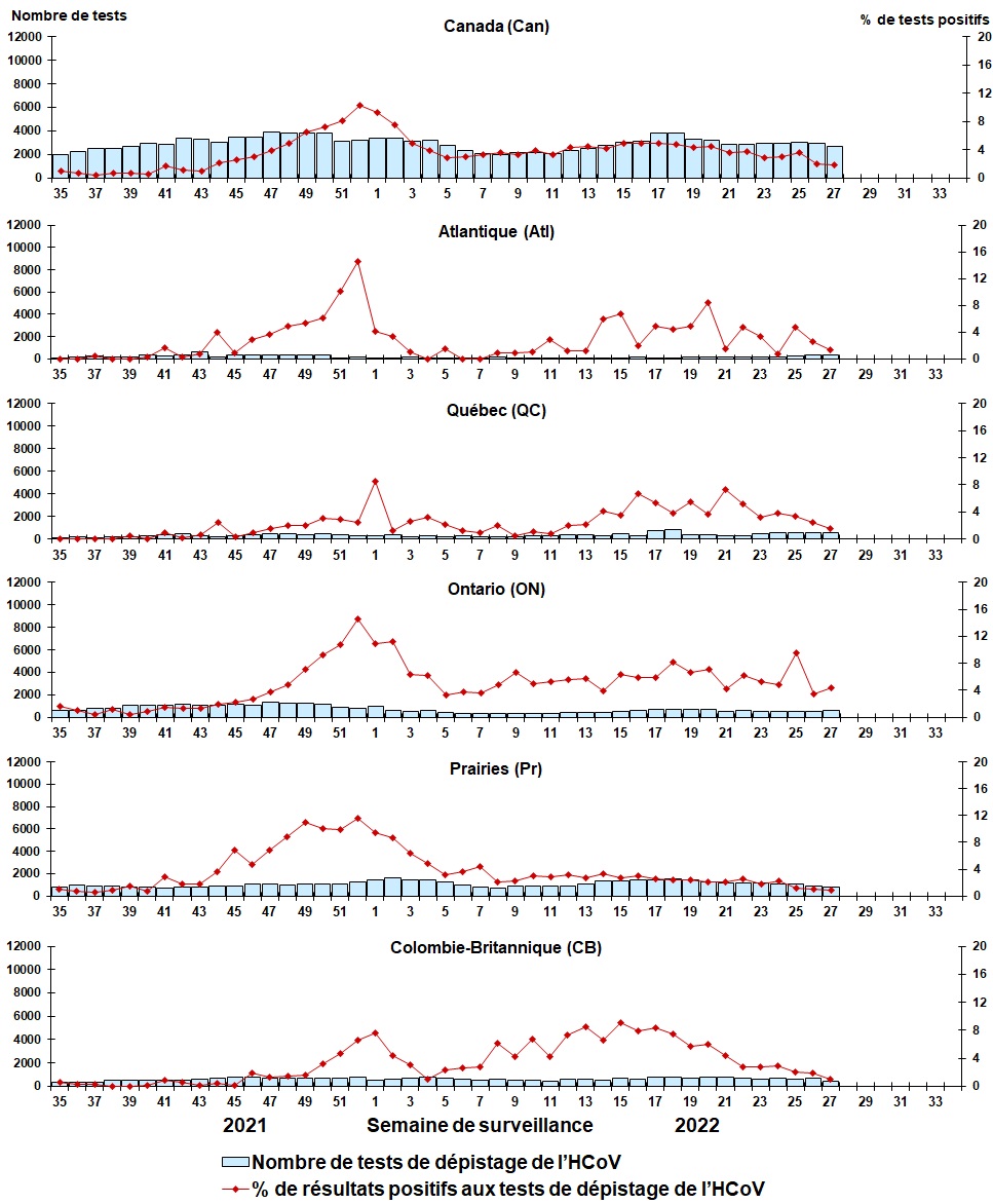 | Semaine | Fin de la semaine | Can Tests | HCoV% | Atl Tests | HCoV% | QC Tests | HCoV% | ON Tests | HCoV% | Pr Tests | HCoV% | CB Tests | HCoV% |