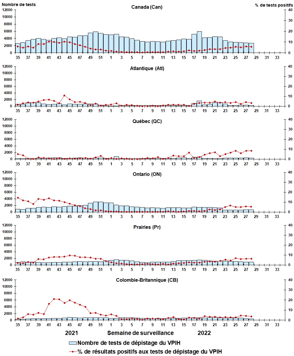 | Semaine | Fin de la semaine | Can Tests | EV/RV% | Atl Tests | EV/RV% | QC Tests | EV/RV% | ON Tests | EV/RV% | Pr Tests | EV/RV% | CB Tests | EV/RV% |