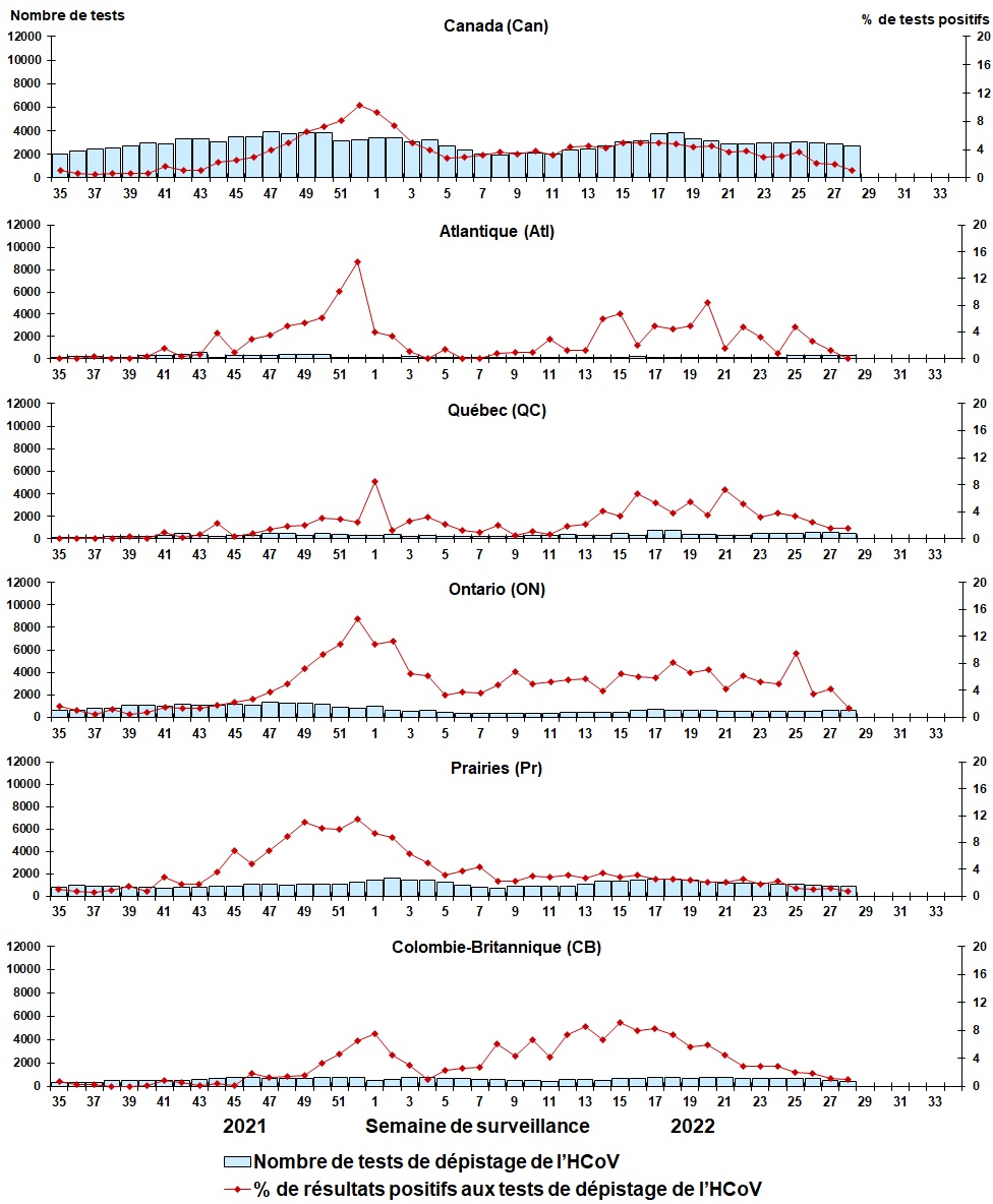 | Semaine | Fin de la semaine | Can Tests | HCoV% | Atl Tests | HCoV% | QC Tests | HCoV% | ON Tests | HCoV% | Pr Tests | HCoV% | CB Tests | HCoV% |
