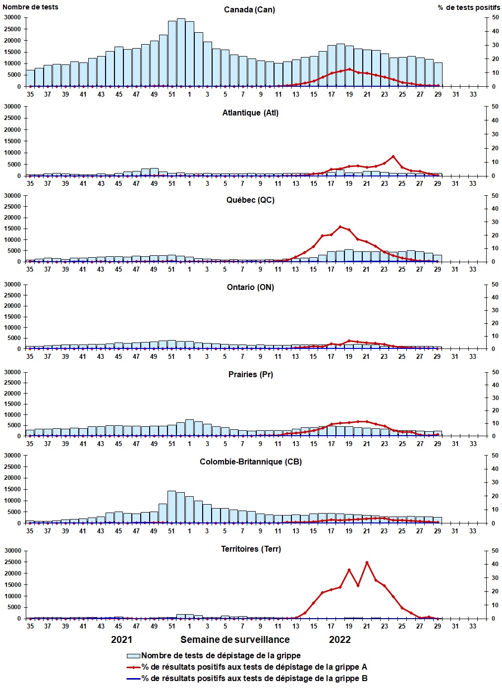 - L'activité de la grippe se situe dans les niveaux intersaisonniers, avec seulement 69 détections (64 grippe A et 5 grippe B) signalées au cours de la semaine 29 (semaine se terminant le 23 juillet 2022).