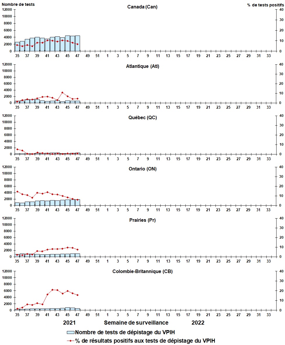 | Semaine | Fin de la semaine | Can Tests | MPVH% | Atl Tests | MPVH% | QC Tests | MPVH% | ON Tests | MPVH% | Pr Tests | MPVH% | CB Tests | MPVH% |