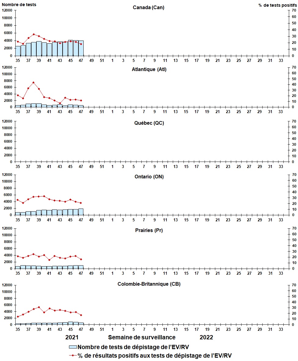 - Le virus respiratoire syncytial (1,223 détections; 8,5 % positifs), les entérovirus et les rhinovirus (721 détections; 18,1 % positifs), et le virus parainfluenza humain (301 détections; 6,7 % positifs) sont les virus des voies respiratoires saisonniers les plus fréquemment détectés au Canada.