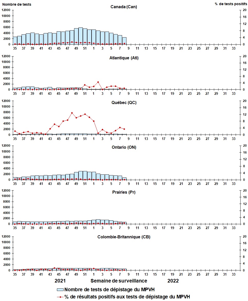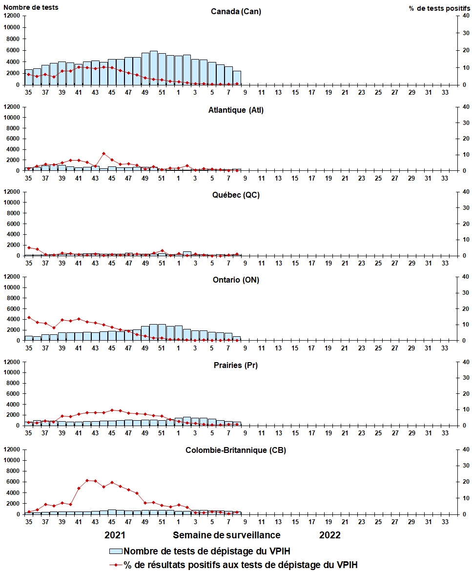 | Semaine | Fin de la semaine | Can Tests | MPVH% | Atl Tests | MPVH% | QC Tests | MPVH% | ON Tests | MPVH% | Pr Tests | MPVH% | CB Tests | MPVH% |