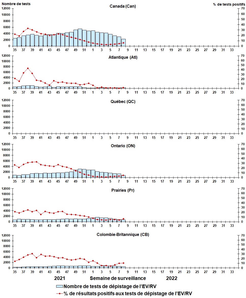 Figure 8 : Résultats positifs (%) aux tests de dépistage de l'entérovirus/du rhinovirus (EV/RV) au Canada par région et par semaine de surveillance