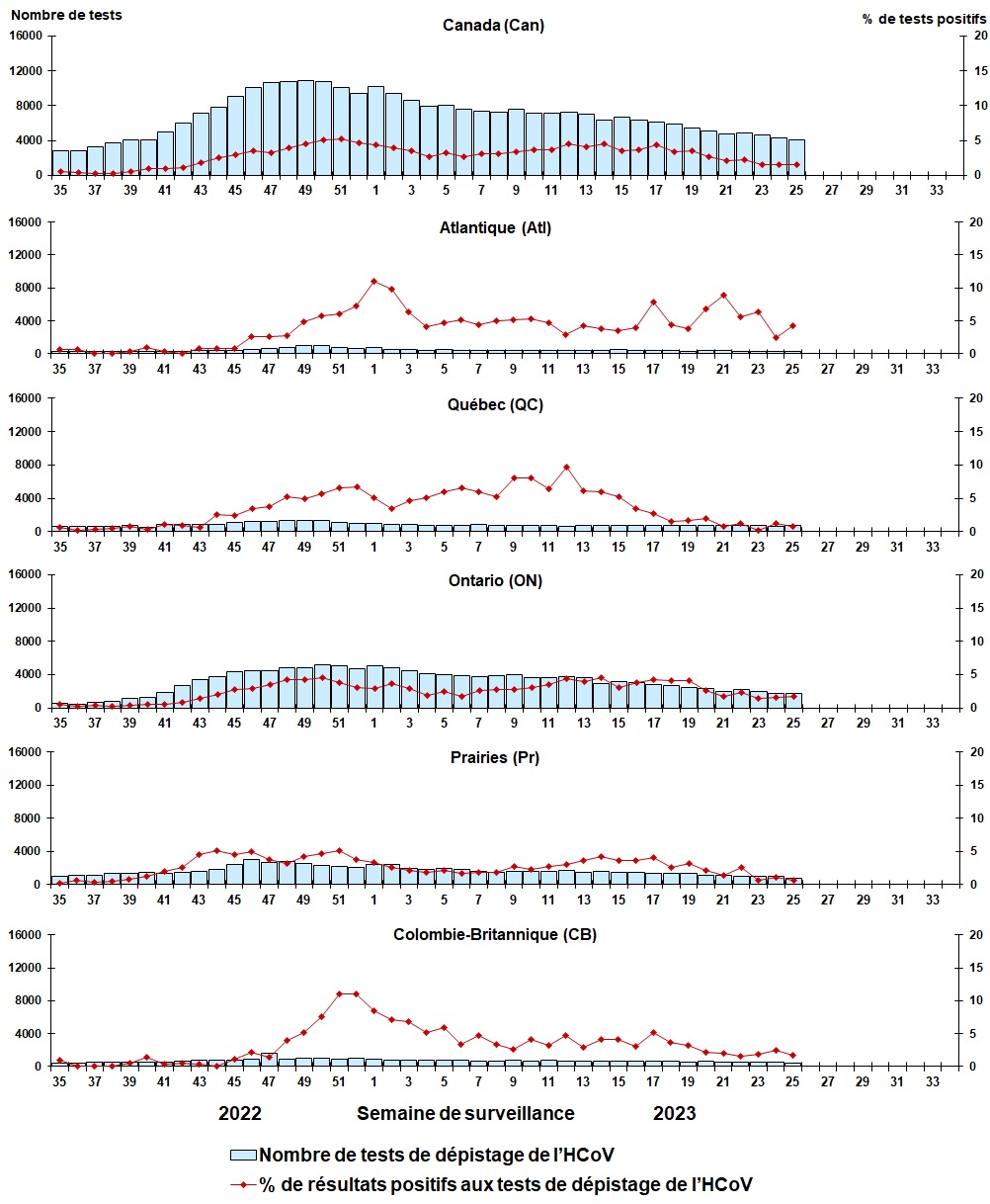 | Semaine | Fin de la semaine | Can Tests | HCoV% | Atl Tests | HCoV% | QC Tests | HCoV% | ON Tests | HCoV% | Pr Tests | HCoV% | CB Tests | HCoV% |
